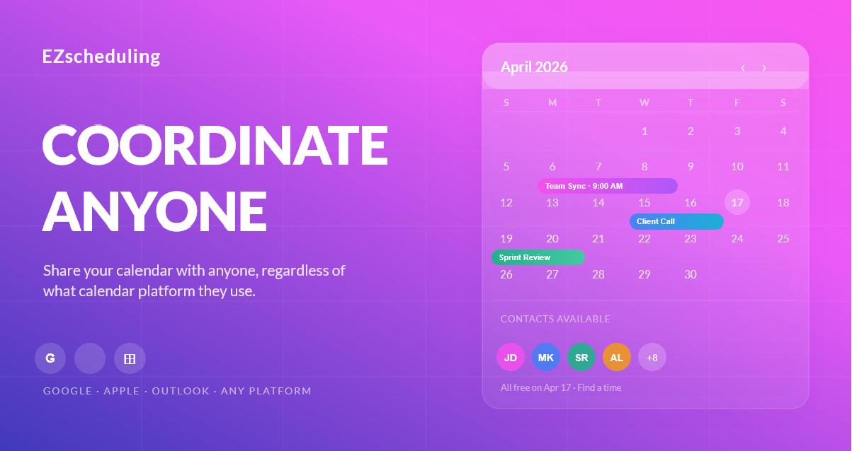 EZscheduling brings everyone together on one unified calendar view, no matter what platform they use. Whether your contacts use Google Calendar, Apple Calendar, Outlook, or any other system, you can see their availability and coordinate seamlessly.